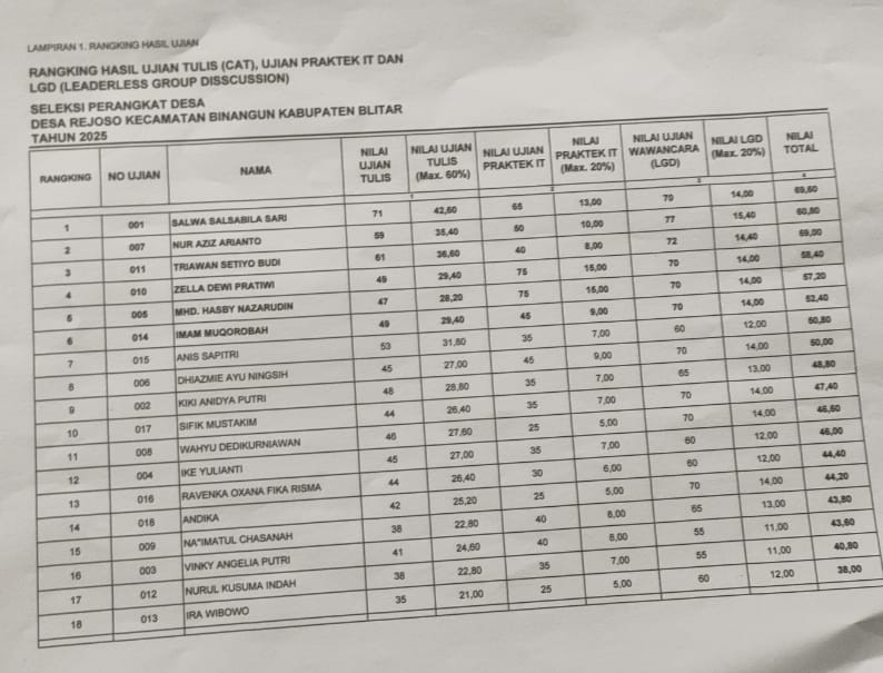 Hasil akhir ujian tertulis berbasis Komputer (CAT) , ujian kompetensi praktek IT Microsoft Word dan Microsoft Excel dan ujian wawancara dalam rangka penjaringan dan penyaringan calon perangkat desa Rejoso kali ini diperoleh nilai yang telah dirangking sebagai berikut :
